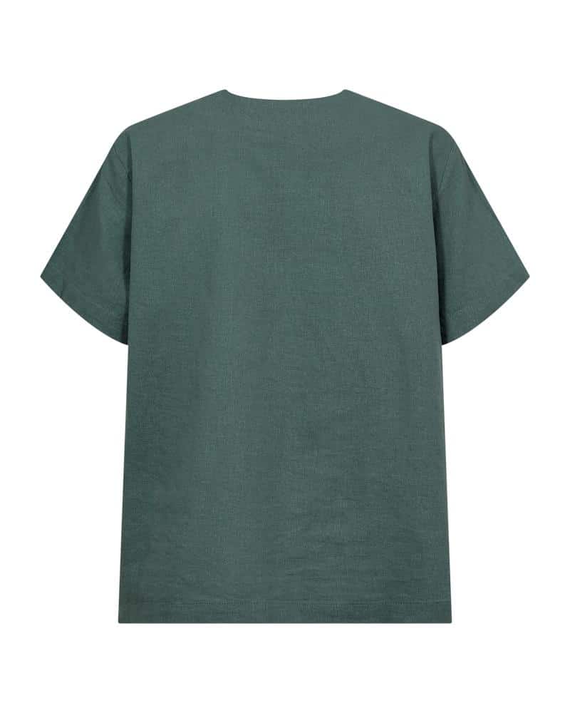 Freequent blouse FQlava 208150. Model FQLAVA-SHIRT 208150. In de kleur dark forest. De blouse is gemaakt van een ademende linnenmix. De V-hals en knoopsluiting geven het ontwerp een elegante touch, terwijl de korte mouwen zorgen voor een casual en frisse look.