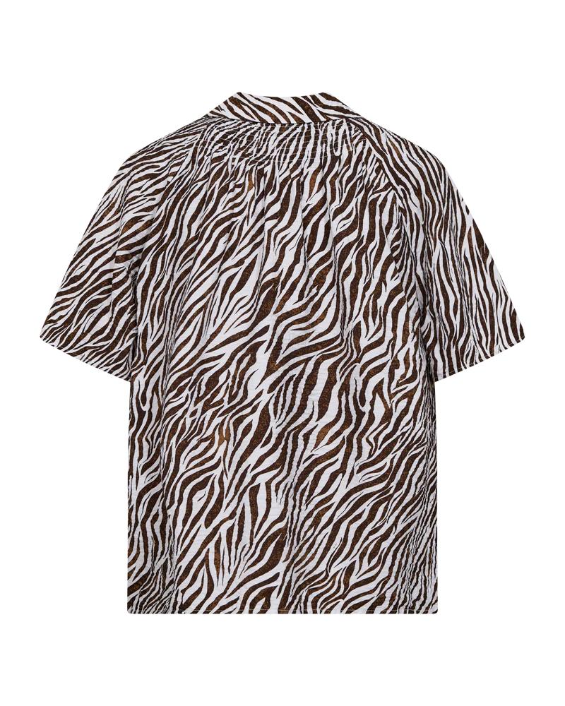 Freequent blouse FQmele 208114. Model FQMELE-SHIRT. In de kleur brilliant white/coffee bean. Blouse met zebraprint, V-hals en knoopsluiting. Losse pasvorm met korte wijde mouwen en co-ord styling.