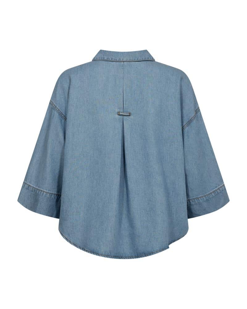 Freequent blouse FQmilo 207843. Model FQMILO-SHIRT. In de kleur light blue denim. De blouse is gemaakt van 100% lyocell. De zachte spijkerstof zorgt voor een luxe uitstraling. De V-hals en omgeslagen kraag geven het ontwerp een elegante en eigentijdse twist, terwijl de knoopsluiting zorgt voor een nette afwerking.