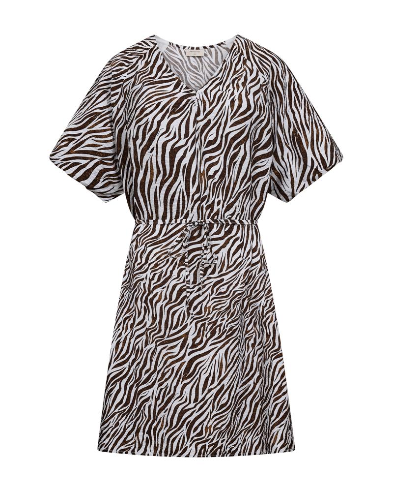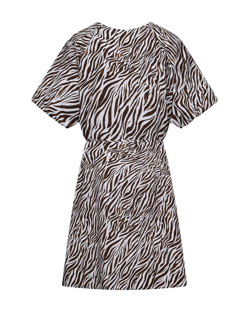 Freequent jurk FQmele 208113. Model FQMELE-DRESS. In de kleur brilliant white/coffee bean. Jurk met zebraprint, V-hals en strikceintuur in de taille. Zachte stof met ballonmouwen en vrouwelijke, zwierige pasvorm.