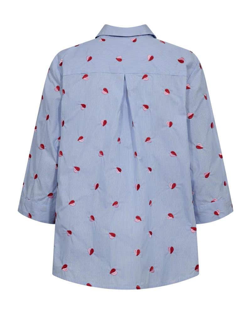 Freequent shirt FQrosan 207696. Model FQROSAN-SHIRT. In de kleur blue bell. Dit shirt combineert een streeppatroon met subtiele, geborduurde hartjes voor een charmante en eigentijdse uitstraling.