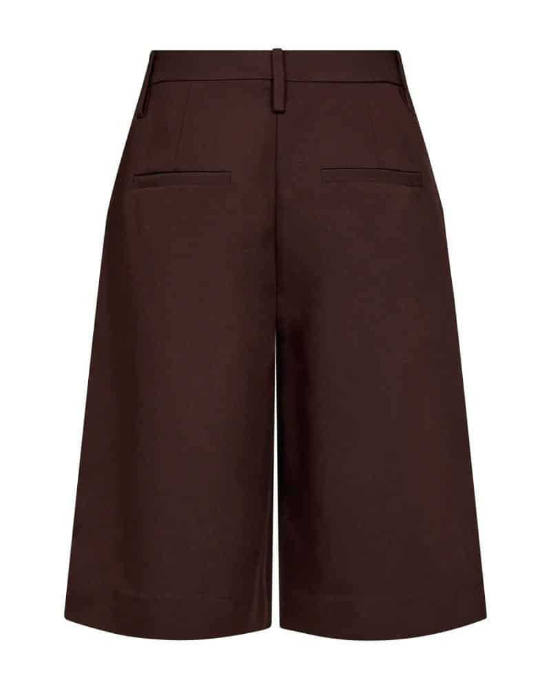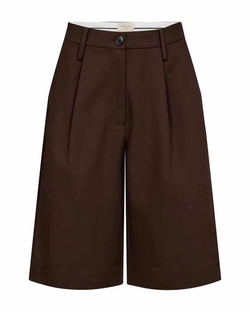 Freequent short FQmaeve 208187. Model FQMAEVE-SHORTS. In de kleur coffee bean. Korte broek met knoop- en ritssluiting, wijde pijpen en plooien aan de voorkant.