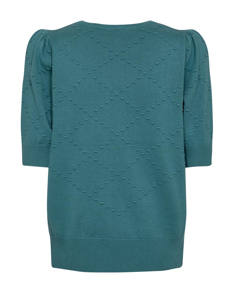 De trui heeft een aansluitende pasvorm die je figuur mooi accentueert, en is voorzien van een ronde hals, ribboorden en stijlvolle korte pofmouwen voor een elegante, speelse look. Het subtiele dessin in de breistructuur geeft de pullover extra karakter.