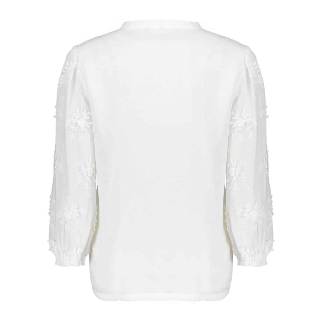 Geisha blouse bloem 63230-26. In de kleur off-white. Een elegante en vrouwelijke blouse met een V-hals en een knoopsluiting. De 3D bloemen op de voorkant geven de blouse een speels en uniek accent, terwijl de 3/4 mouwen met elastische boord zorgen voor een comfortabele pasvorm.