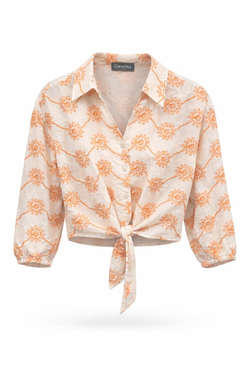 Geisha blouse bloem 63360-21. In de kleur off-white/peach. Geisha blouse met geborduurde bloemen, 3/4 mouwen en korte lengte. Luchtige katoenen blouse met knoopsluiting en vrouwelijke details.