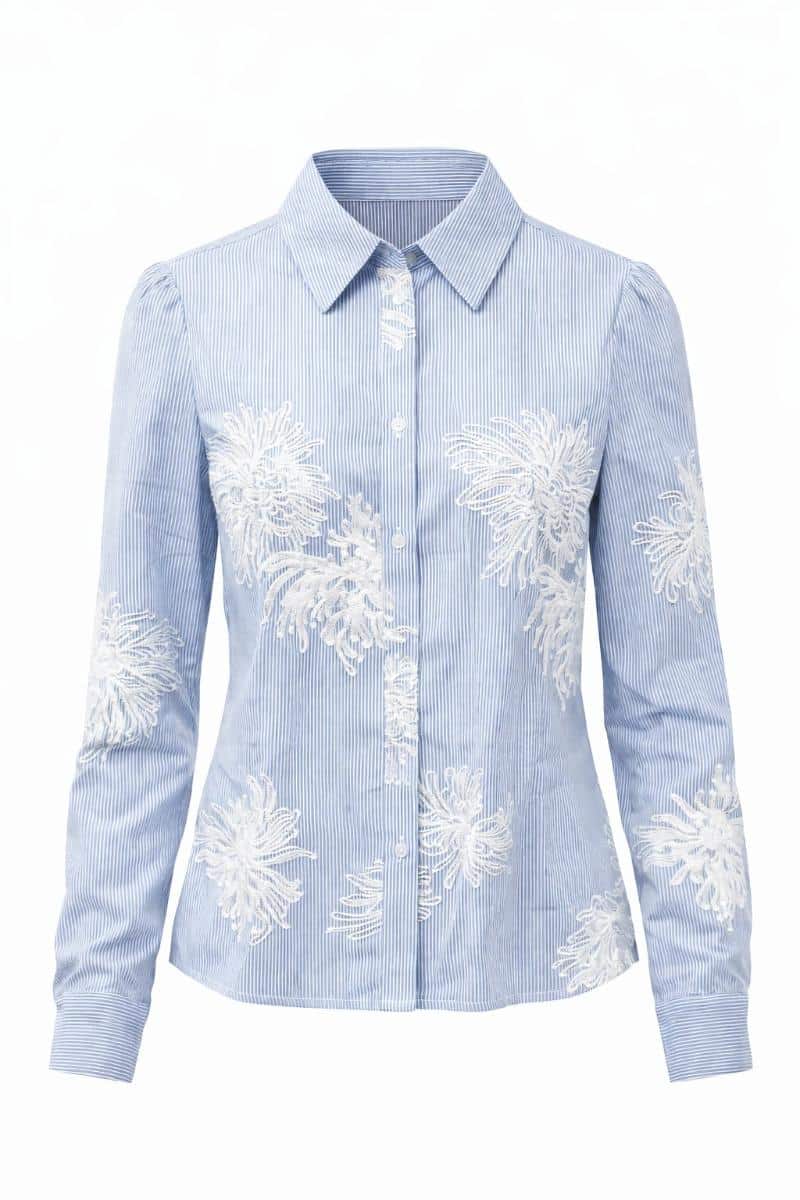De blouse is uitgevoerd met een kraag, knoopsluiting en lange mouwen. De subtiele geborduurde bloemen geven de blauw-witte strepen een trendy en unieke twist.
