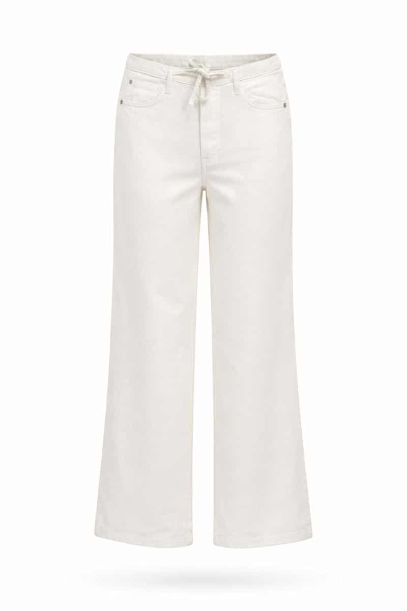 De hoge taille zorgt voor een flatterende pasvorm, terwijl de wide leg pijpen zorgen voor een moderne en elegante uitstraling. De broek is voorzien van een knoop- en ritssluiting, een elastische achterkant en een trekkoord in de taille voor extra comfort en een flexibele fit. Het 5-pocket design geeft de broek een casual touch.