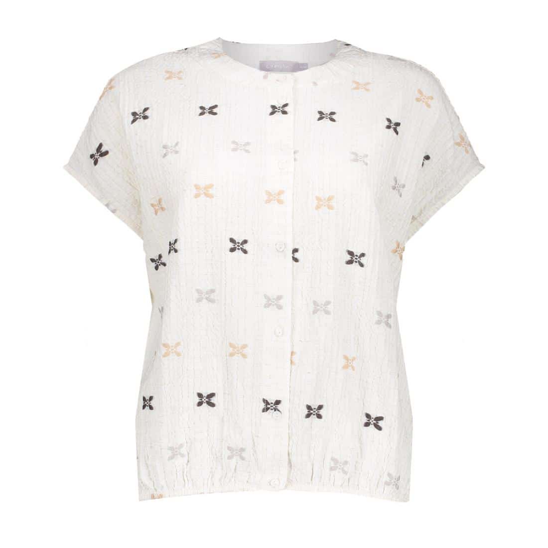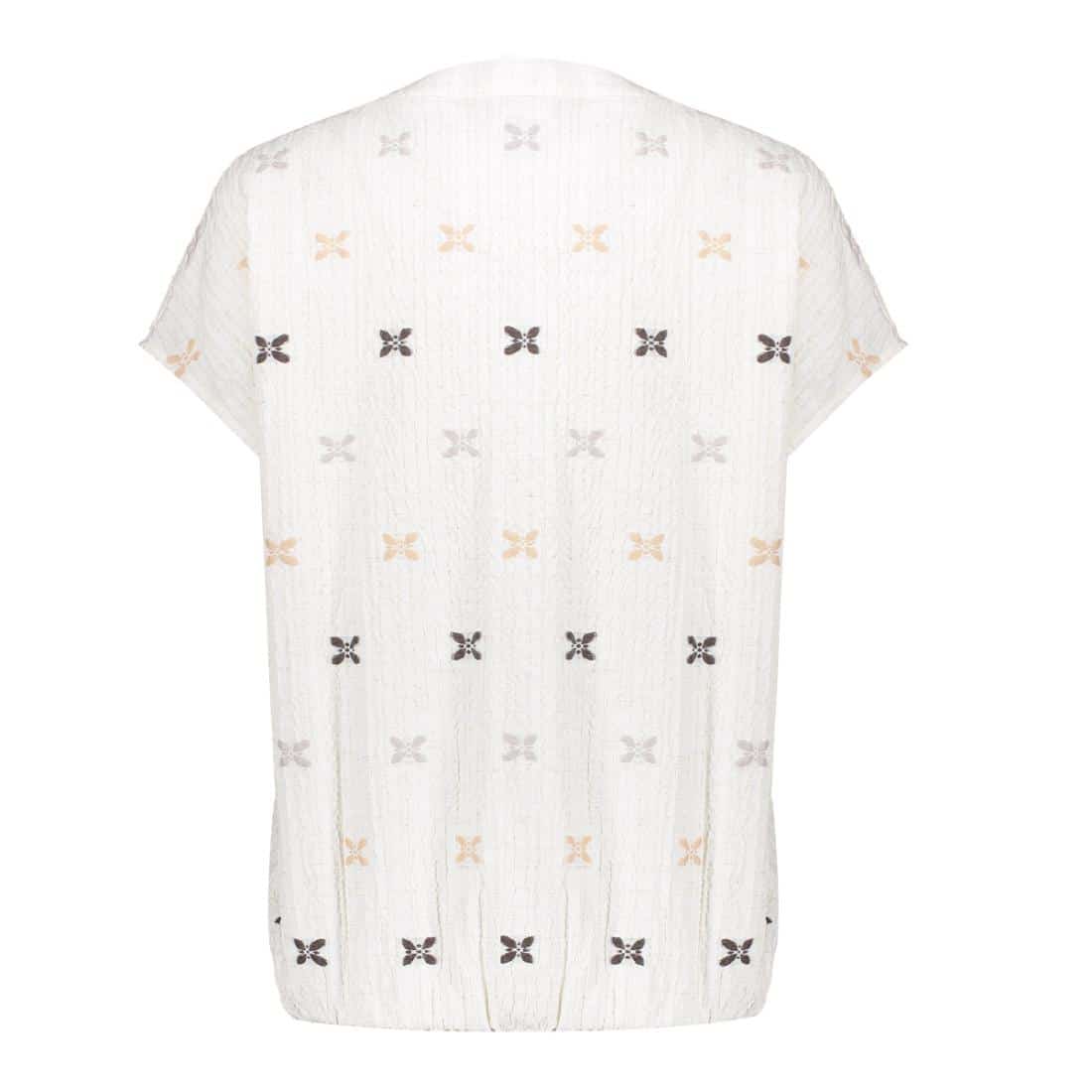 Geisha dames blouse 63444-20. In de kleur sand/off white. Blouse met V-hals, knoopsluiting en korte mouwen. Geborduurde vlinders, elastische zoom en comfortabele, ruimvallende fit.