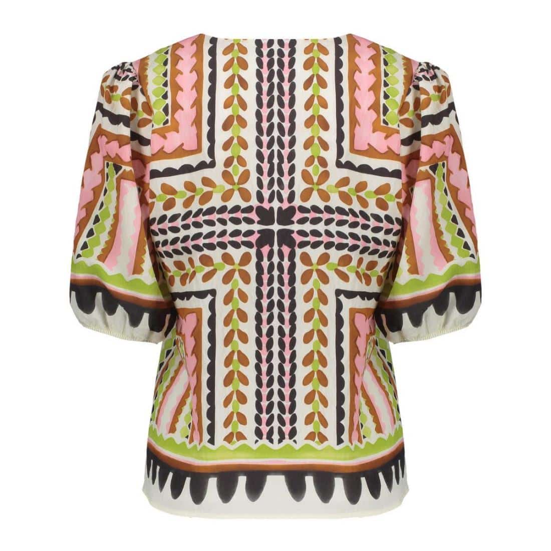 Geisha dames shirt 63255-20. In de kleur ecru,pink, cactus. Het shirt heeft een elegante V-hals die zorgt voor een flatterende uitstraling, terwijl de korte pofmouwen met elastiek een speels en vrouwelijk detail toevoegen.