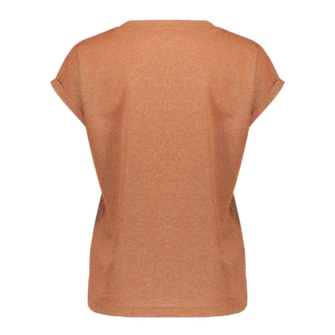 Geisha shirt glitter 62351-24. In de kleur ginger. Dankzij het gebruik van lurexdraad krijgt het T- shirt een subtiele glans. Het shirt heeft een V-hals en korte mouwen met een speelse omslag.