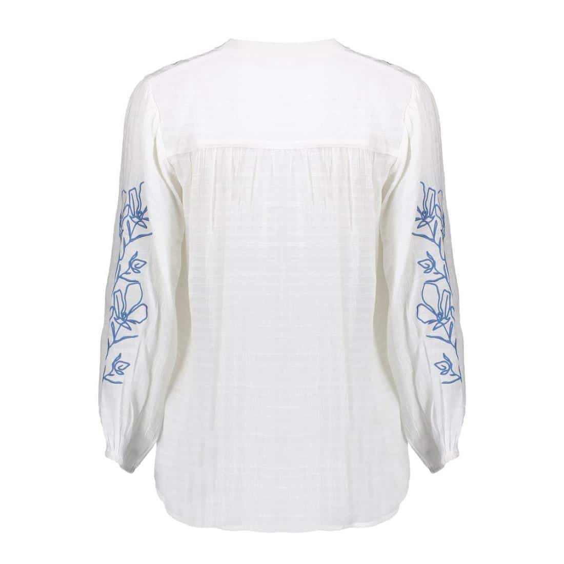 Geisha wit shirt 63069-14. In de kleur white. Het shirt heeft een V-hals en lange mouwen met elastische boorden, wat zorgt voor een comfortabele en vrouwelijke pasvorm. De halve knoopsluiting maakt het gemakkelijk om het shirt aan- en uit te trekken, terwijl de geborduurde details een subtiel en stijlvol accent toevoegen.