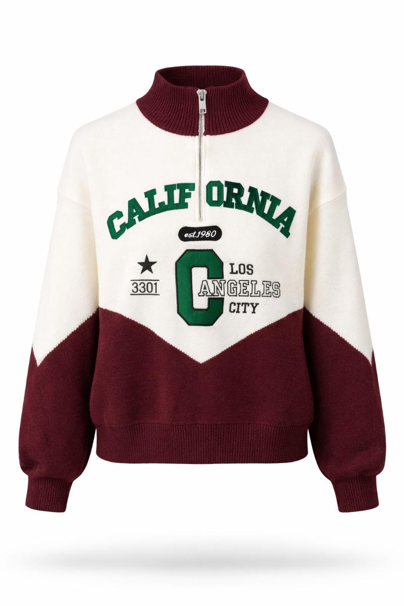 Nouveau Fashion gebreide trui. In de kleur bordeaux met ecru. Gebreide trui in combineert een hoge hals met ritssluiting en een trendy, comfortabele uitstraling.