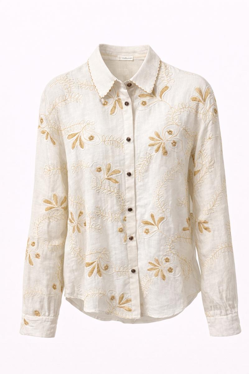 Nouveau Fashion blouse. In de kleur ecru met geborduurde details. Deze blouse combineert de rustieke uitstraling van een linnenlook met het ademende comfort van 100% katoen. De blikvanger van dit item zijn de geborduurde details, die de blouse een luxe en unieke uitstraling geven.