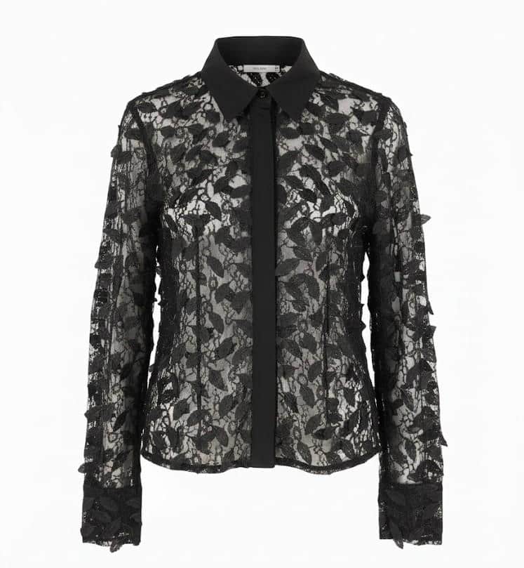 De Nouveau Fashion mesh blouse zwart is een elegant en trendy item met een verfijnde uitstraling. De blouse heeft lange mouwen, een kraag en een knoopsluiting. De doorschijnende mesh stof met subtiele bladerenprint geeft de blouse een modieuze en vrouwelijke look.