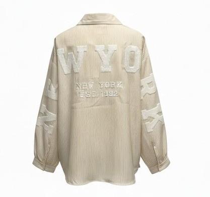 Nouveau Fashion gestreepte blouse. In de kleur wit en beige. Gestreepte blouse in wit en beige met tekstprint op achterkant. Trendy oversized model met kraag en knoopsluiting.