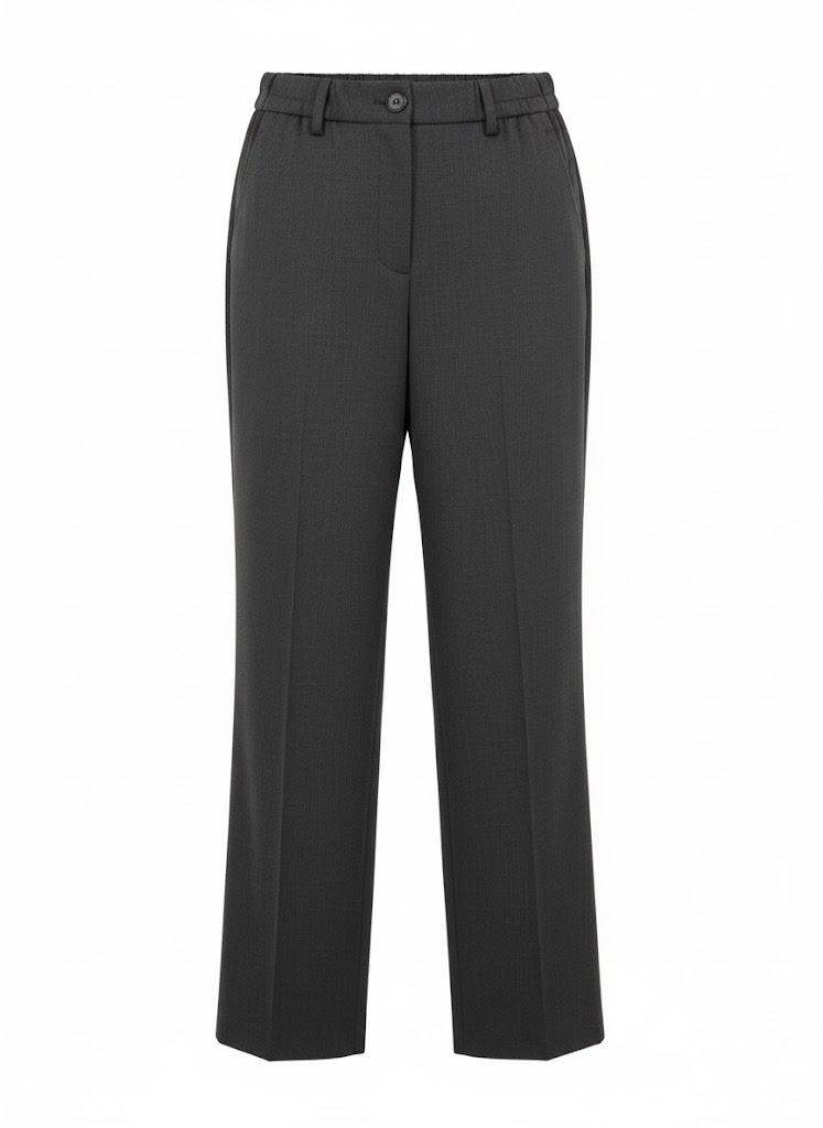 Nouveau Fashion grijze broek. Pantalon met hoge taille, wijde rechte pijpen en elastiek achter. Comfortabel en stijlvol met knoop- en ritssluiting.