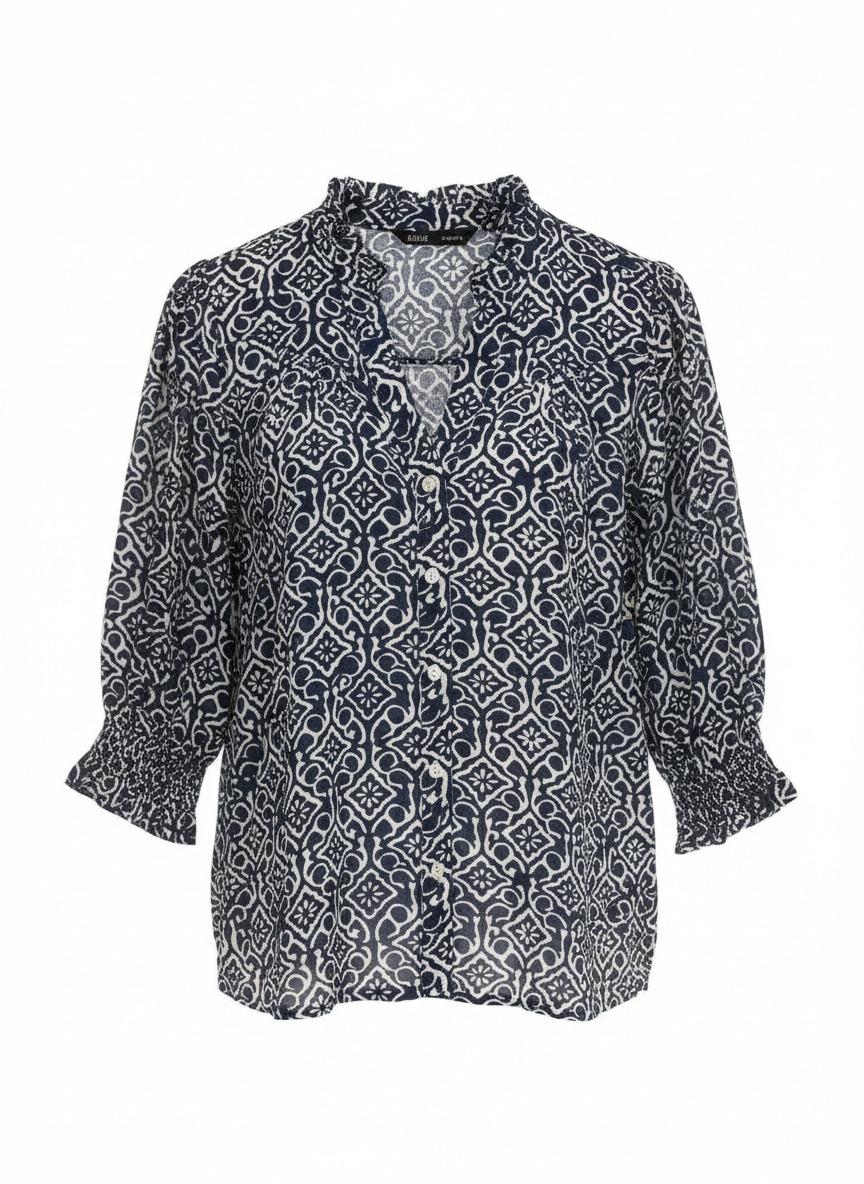 De blouse is uitgevoerd met een flatterende V-hals en subtiele ruches bij de hals. De 3/4 pofmouwen met elastiek in de manchetten geven het ontwerp een trendy en vrouwelijke uitstraling. Dankzij de knoopsluiting kun je de blouse zowel netjes gesloten als iets nonchalanter open dragen.