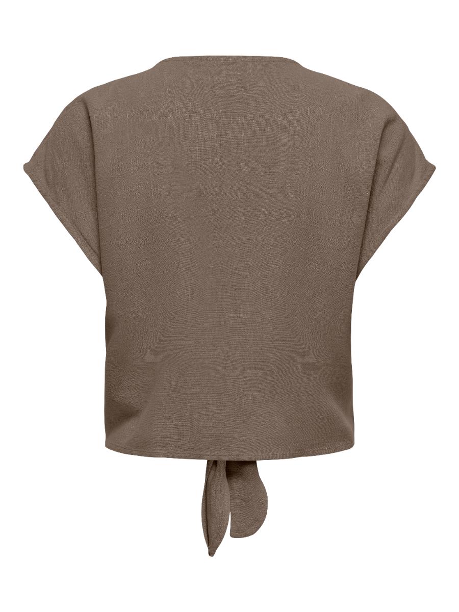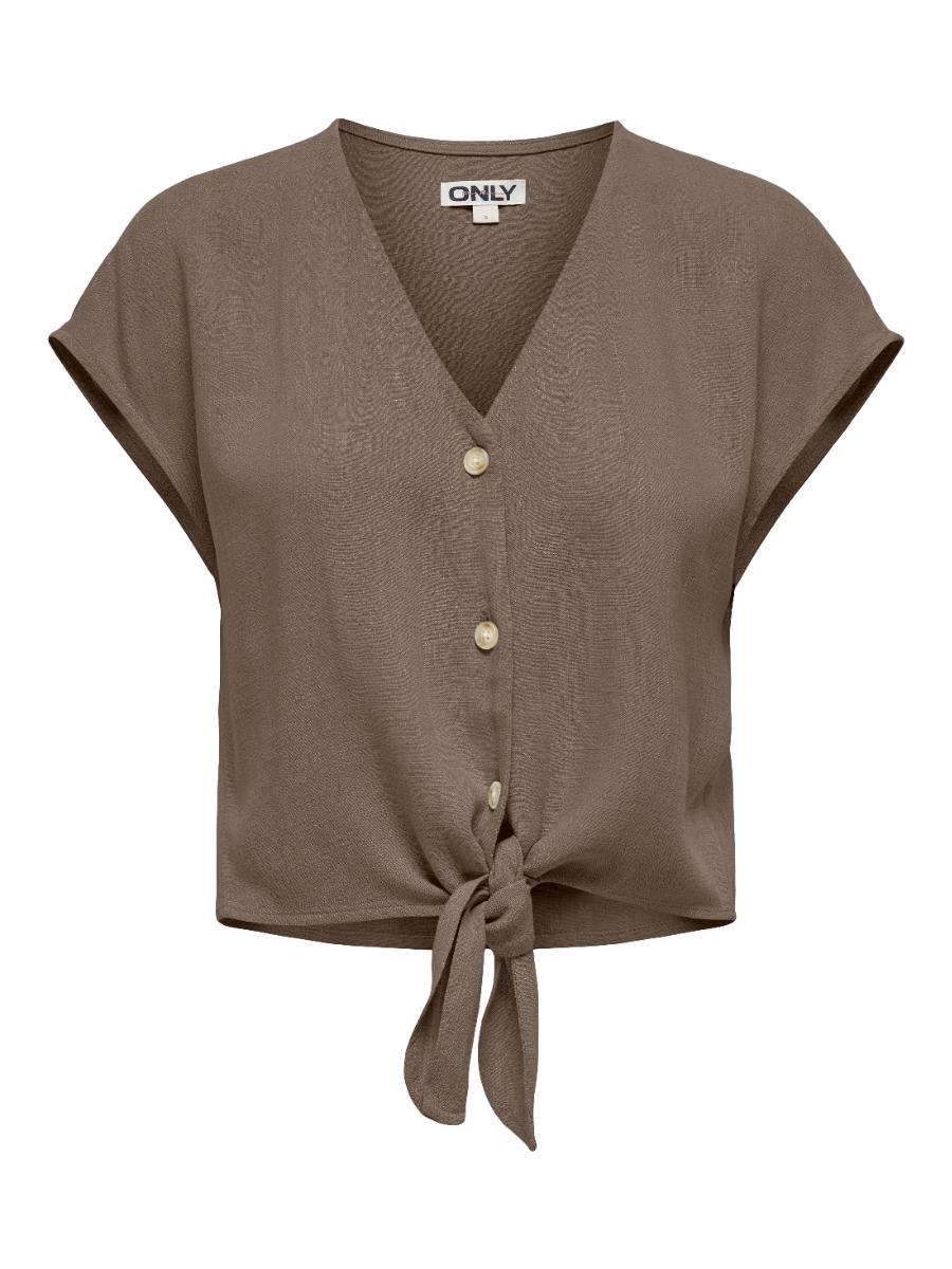 Only blouse ONLSIESTA 15322270. Model ONLSIESTA SS KNOT LIN BL SHIRT PNT NOOS. In de kleur walnut. Blouse met overhemdkraag, korte mouwen en knoopsluiting. Linnenlook met knoopdetail en regular fit co-ord blouse.