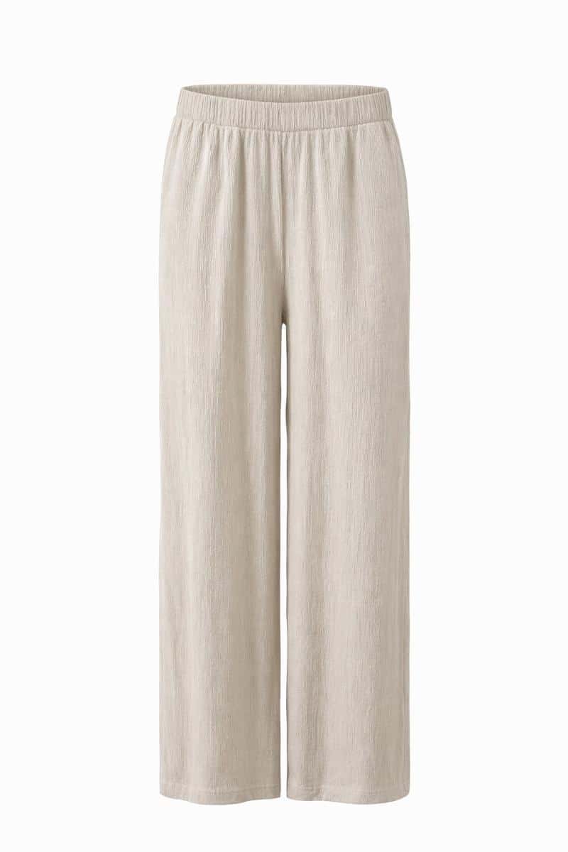 De broek is uitgevoerd in een luxe crêpe stof. Deze stof geeft de broek een prachtige structuur en een chique valling, terwijl het materiaal nagenoeg kreukvrij blijft. Met de wijde pijpen (wide leg) creëer je direct een modieus silhouet dat zowel elegant als ontspannen oogt.