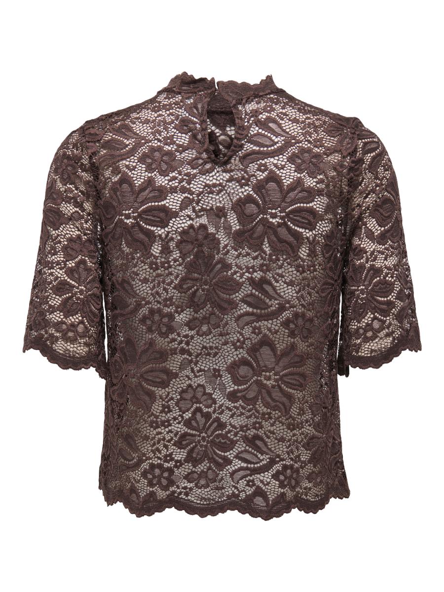 Only shirt ONLBETH 15371957. Model ONLBETH LACE S/S TOP JRS. In de kleur bruin. Het kanten shirt is gemaakt van een zachte mix van 90% polyamide (nylon) en 10% elastaan.