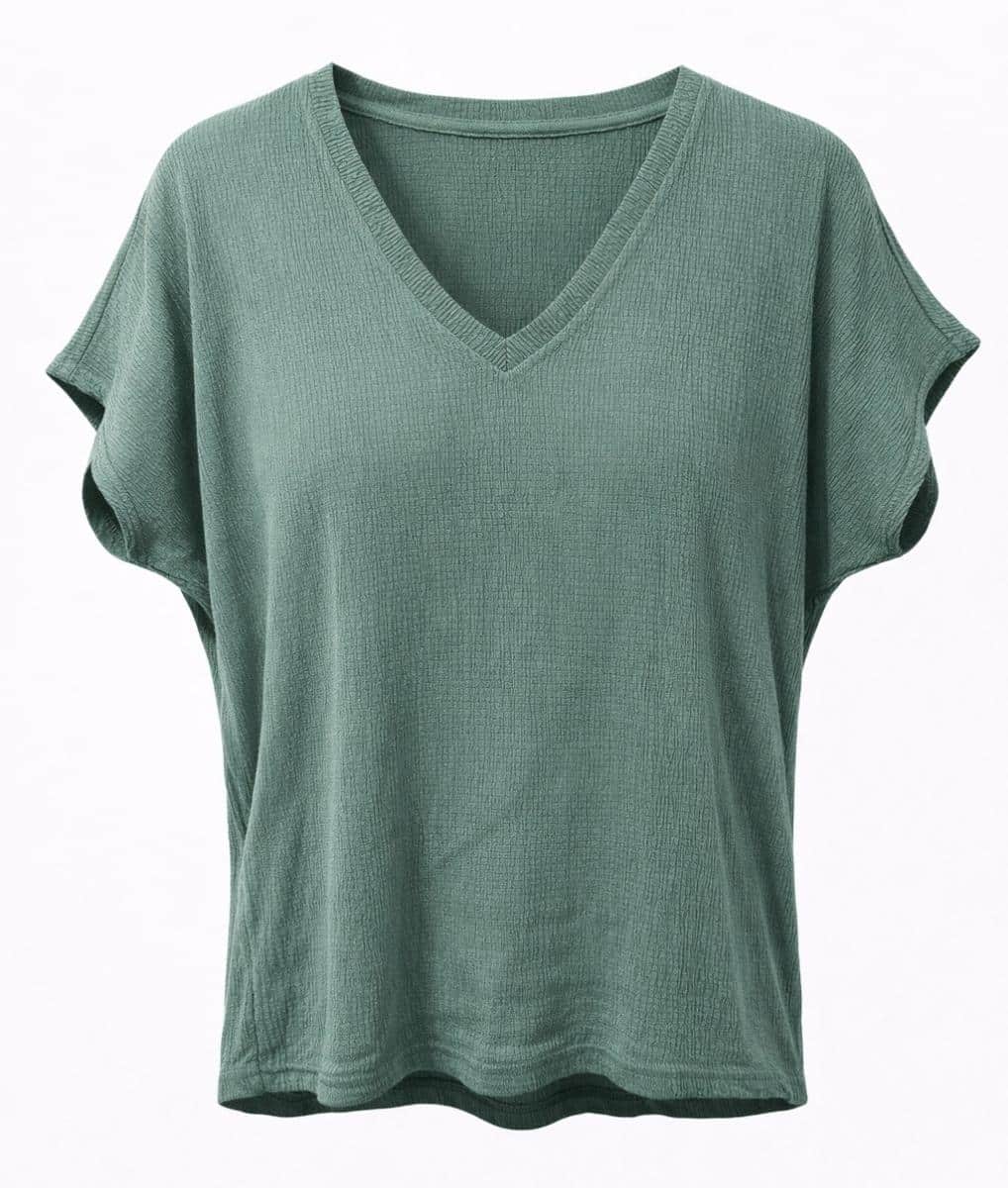 Dit shirt heeft een subtiele textuur en de zachte groene kleur maken dit item eenvoudig te combineren en perfect voor elk seizoen. Vrouwelijke V-hals voor een elegant accent. Comfortabele korte mouwen.