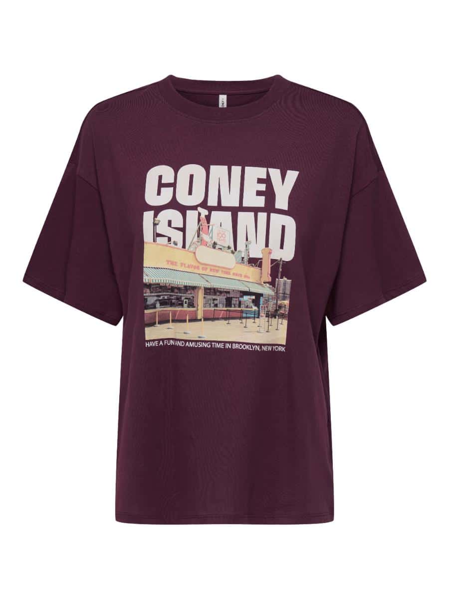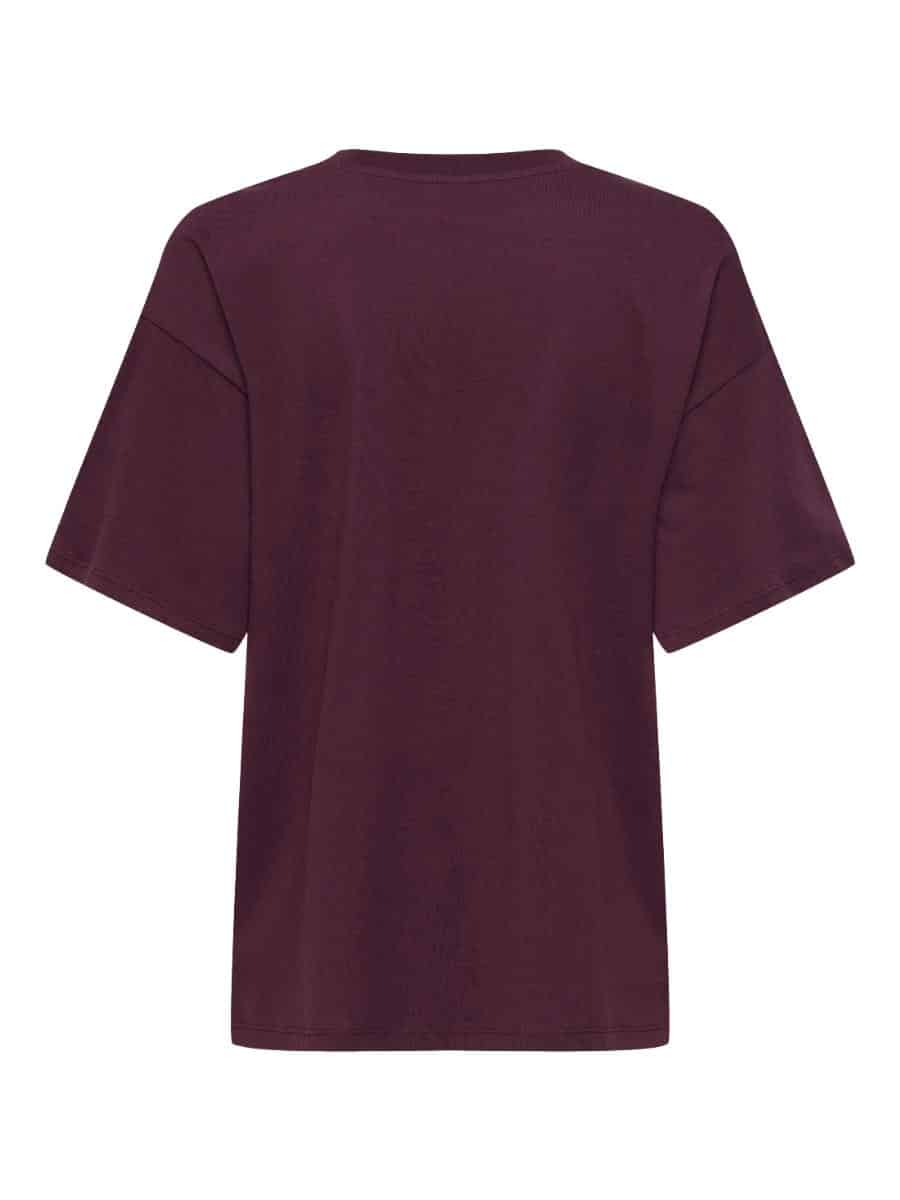 Only shirt ONLMILA 15372177. Model ONLMILA S/S PRINT BOX JRS. In de kleur grape wine. T-shirt met een comfortabele regular fit en valt wat ruimer. De O-hals en korte mouwen maken het een ideaal item voor dagelijks gebruik.