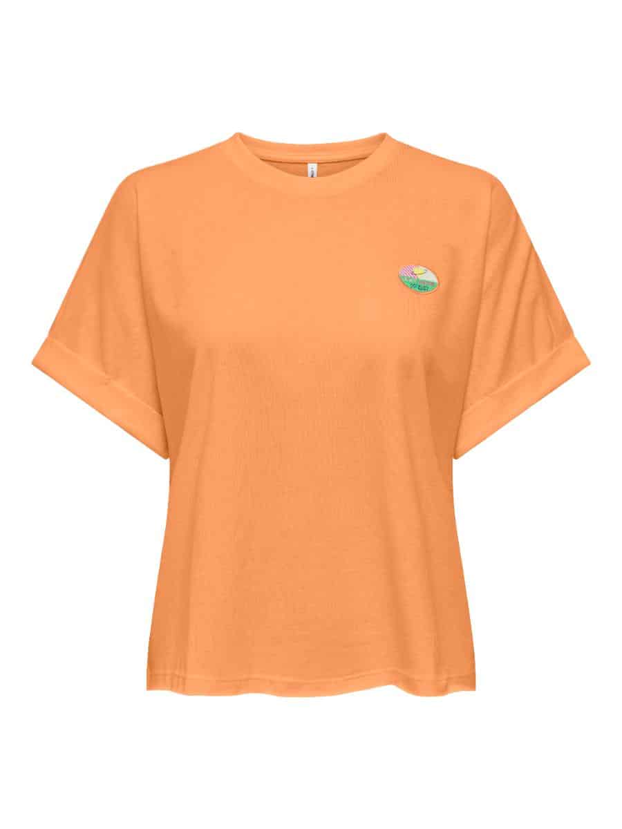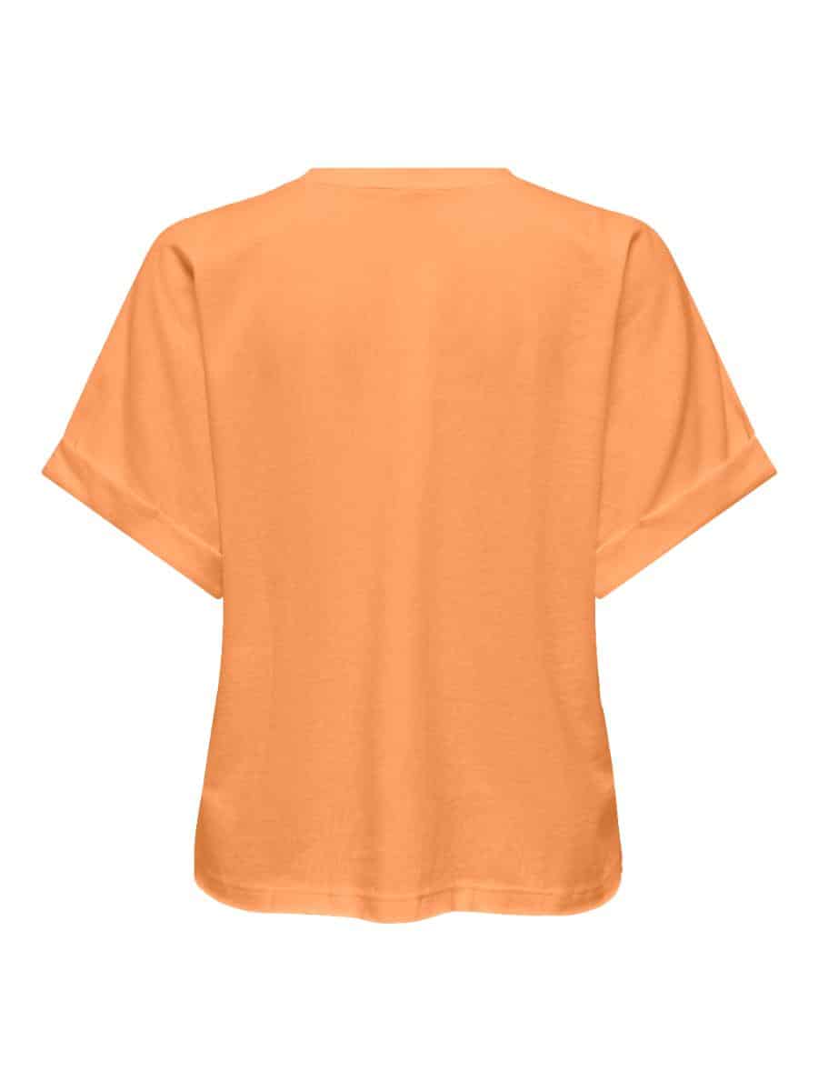 Only shirt ONLMINNA 15378313. Model ONLMINNA S/S TOP CS PR JRS. In de kleur mock orange. Shirt met ronde hals en korte mouwen met omslag. Zacht shirt met print op de borst en comfortabele co-ord pasvorm.