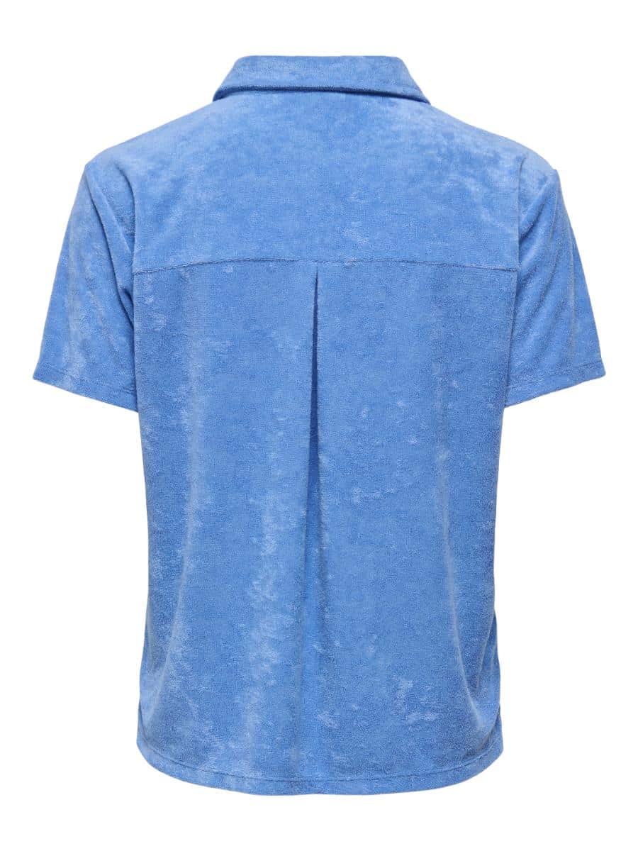 Only sweater ONLHOLLYTERRY. Model ONLHOLLYTERRY S/S PLACKET UB SWT. In de kleur ultramarine. De sweater is gemaakt van een zachte badstofmix van polyester en viscose. De kraag en knoopsluiting aan de voorkant geven het ontwerp een nette touch, terwijl het embleem op de borst een sportief detail toevoegt.