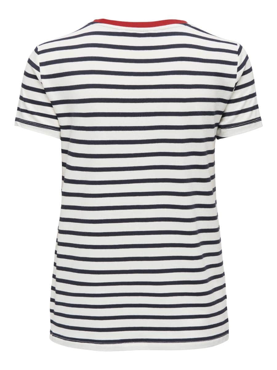 Only T-shirt ONLHEART 15318959. Model ONLHEART LIFE S/S TEE JRS NOOS. In de kleur cloud dancer. Een stijlvol gestreept shirt met rood accent, O-hals en een geborduurde hartje.