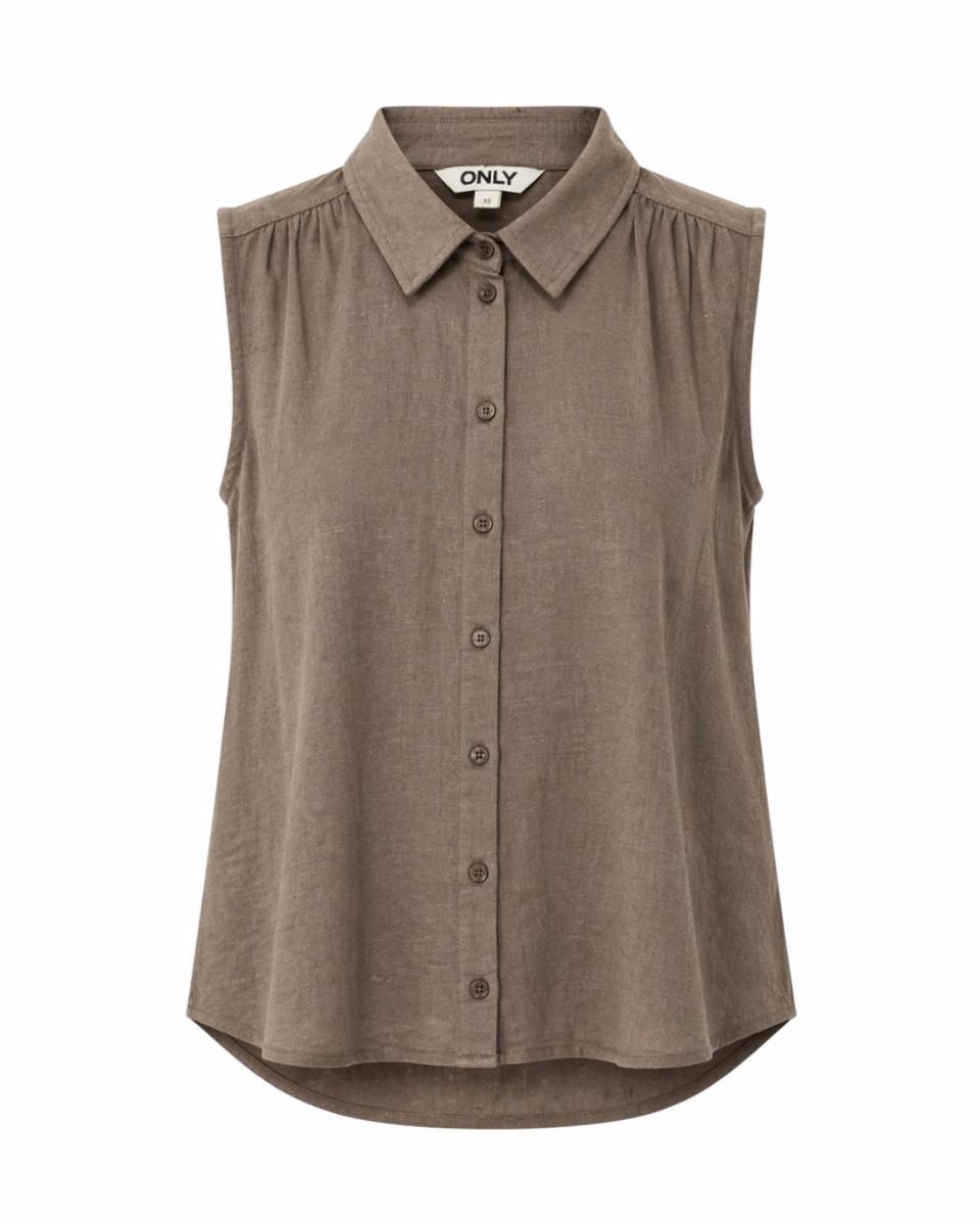 Only top ONLSIESTA 15367416. Model ONLSIESTA S/L LINEN BL SHIRT PNT NOOS. In de kleur walnut. Top in linnenlook met kraag, knoopsluiting en mouwloos design. Gerimpelde schouders en luchtige, stijlvolle co-ord top.