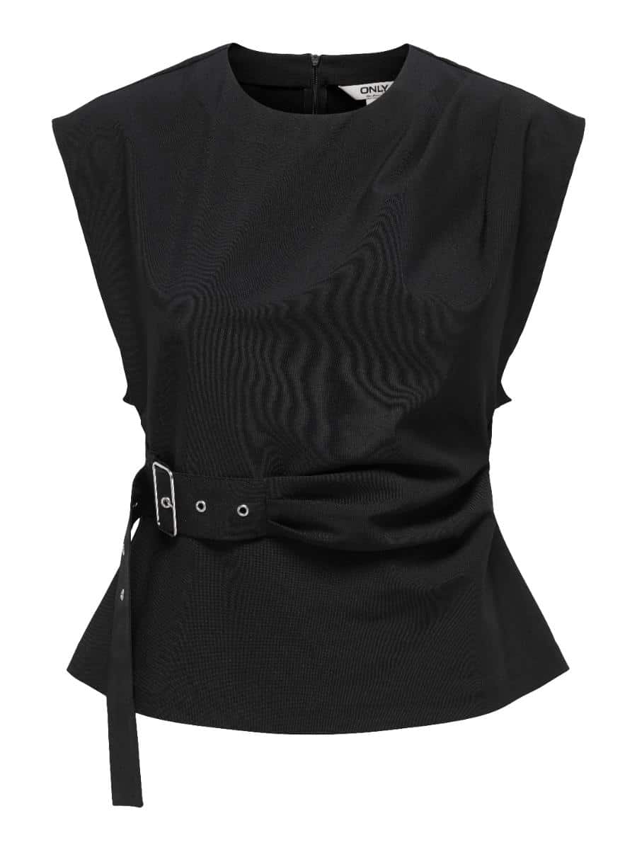 Only top ONLTERRA 15366904. Model ONLTERRA S/L BELT TOP WVN SUD. In de kleur humus. De top is voorzien van een ronde hals en een ritssluiting aan de achterkant.