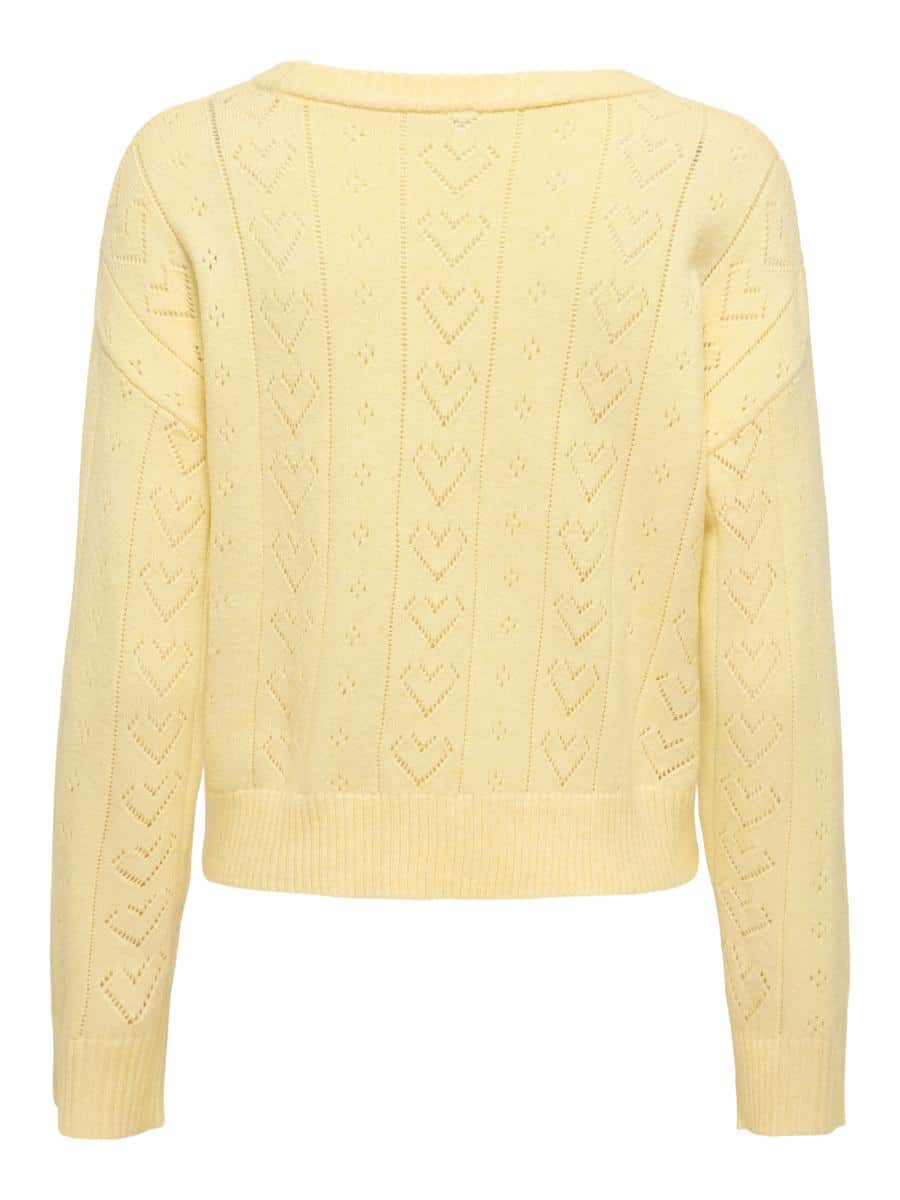 Only trui ONLISA 15363149. Model ONLISA LIFE SL STRUCT BOXY ONECK CC KNT. In de kleur sunlight melange. Een trendy boxy trui met hartjespatroon, ronde hals en een speelse, moderne uitstraling.