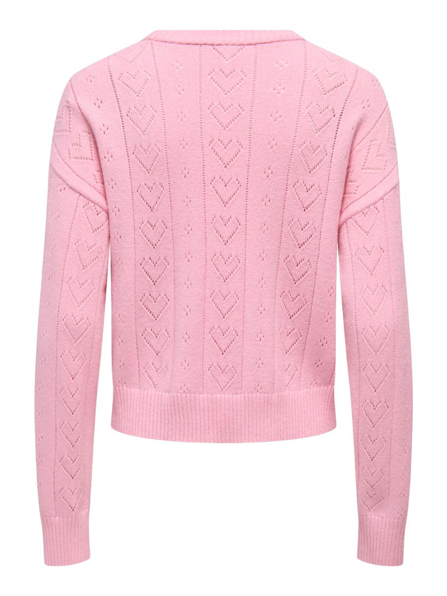 Only trui ONLISA 15363149. Model ONLISA LIFE SL STRUCT BOXY ONECK CC KNT. In de kleur romance rose melange. Een trendy boxy trui met hartjespatroon, ronde hals en een speelse, moderne uitstraling.