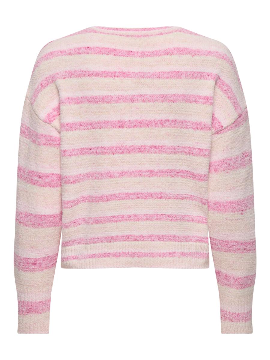 Only trui ONLJOHANNA 15363130. Model ONLJOHANNA LS O-NECK CC KNT. In de kleur roze. Zachte roze trui met chenille structuur en stijlvol streeppatroon. Comfortabele regular fit met o-hals en verlaagde schoudernaden voor een trendy look.