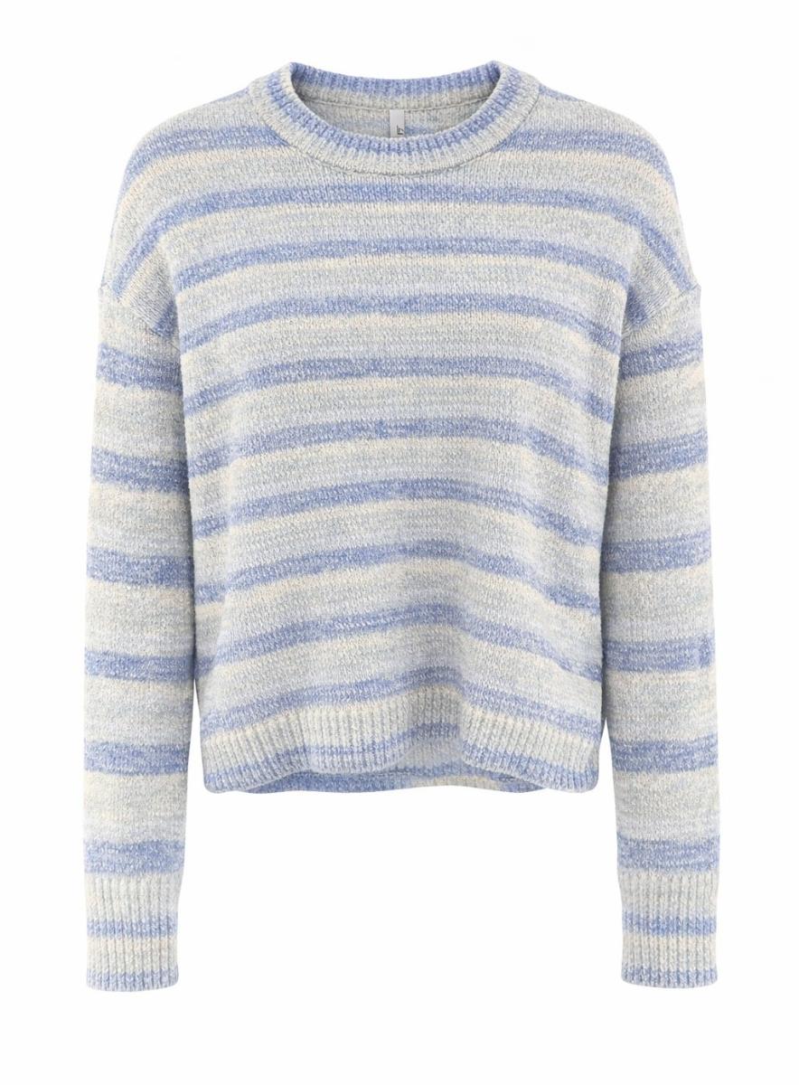 Only trui ONLJOHANNA 15363130. Model ONLJOHANNA LS O-NECK CC KNT. In de kleur riviera. Zachte blauwe trui met chenille structuur en stijlvol streeppatroon. Comfortabele regular fit met o-hals en verlaagde schoudernaden voor een trendy look.