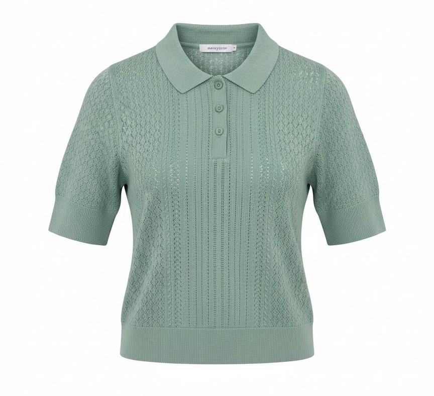 De trui onderscheidt zich door de subtiele opengewerkte structuur, wat de trui een luchtig en vrouwelijk karakter geeft. Het polo-model is voorzien van een nette kraag en een stijlvolle halve knoopsluiting, waardoor je de halslijn naar eigen wens kunt variëren.