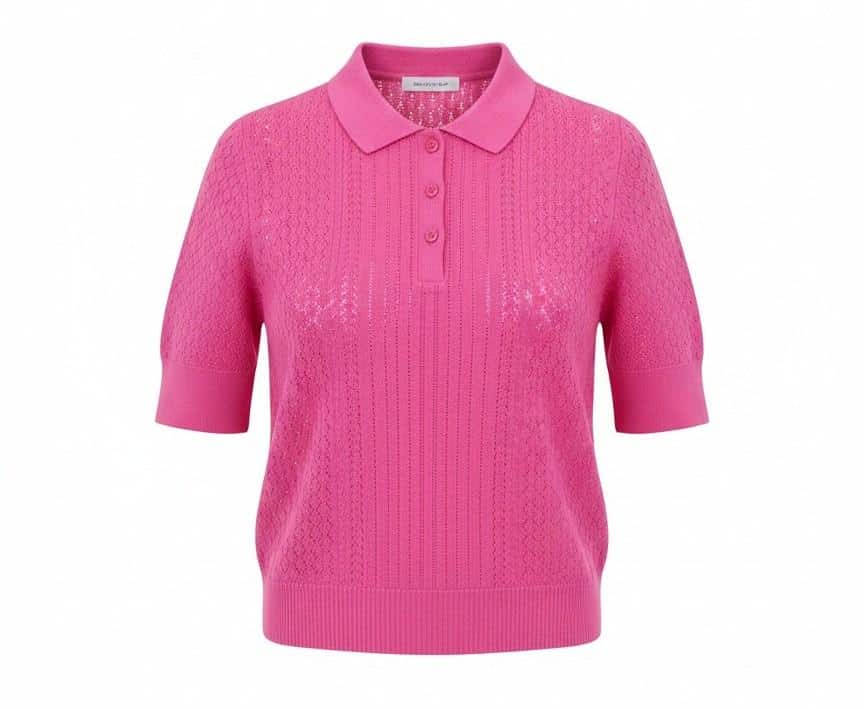 De trui onderscheidt zich door de subtiele opengewerkte structuur, wat de trui een luchtig en vrouwelijk karakter geeft. Het polo-model is voorzien van een nette kraag en een stijlvolle halve knoopsluiting, waardoor je de halslijn naar eigen wens kunt variëren.